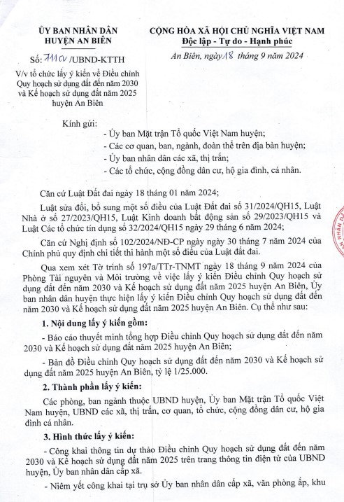 aA Kinh tế - Hạ tầng Tổ chức lấy ý kiến về điều chỉnh quy hoạch sử dụng đất 18/09/2024, 07:31 Quay về Chia sẻ Copy link thành công Tin khác An Giang: Đảm bảo an ninh, trật tự dịp Lễ Quốc khánh 2/9 Đảng - Đoàn thể Hoạt động HDND - UBND Kinh tế - Hạ tầng An sinh - Xã hội Quốc phòng - An Ninh 26/08/2025 Hiệu quả thực hiện phong trào thi đua “Dân vận khéo” Kinh tế - Hạ tầng 27/06/2025 Hiệu quả từ Nguồn vốn ủy thác qua Hội Cựu Chiến Binh trên địa bàn huyện An Biên. Kinh tế - Hạ tầng 27/06/2025 Nguồn vốn tín dụng chính sách đến với người nghèo kịp thời là bàn đạp giúp thoát nghèo bền vững Kinh tế - Hạ tầng 27/05/2025 Nguồn vốn tín dụng Chính sách – Đòn bẩy phát triển mô hình kinh tế thanh niên ở xã Đông Yên tiếp tục giữ vững Nông thôn mới nâng cao Kinh tế - Hạ tầng 27/05/2025 Phòng Giao dịch Ngân hàng chính sách xã hội huyện An Biên tổ chức tập huấn, bồi dưỡng nghiệp vụ, kỹ năng công tác quản lý vốn tại cơ sở Kinh tế - Hạ tầng 27/05/2025 Ban đại diện NHCSXH huyện An Biên tổ chức Hội nghị đánh giá kết quả hoạt động quý I năm 2025, phương hướng nhiệm vụ quý II năm 2025 Kinh tế - Hạ tầng 21/04/2025 Thanh niên xã Nam Thái A khởi nghiệp hiệu quả nhờ nguồn vốn tín dụng Chính sách. Kinh tế - Hạ tầng 27/03/2025 Ngân hàng Chính sách Xã hội huyện An Biên phát huy nguồn vốn hiệu quả với các mô hình phát triển kinh tế trên địa bàn huyện Kinh tế - Hạ tầng 27/03/2025 BỘ TTHC CẤP XÃ 2024 Kinh tế - Hạ tầng 19/12/2024 /chuc-lay-y-kien-ve-dieu-chinh-quy-hoach-su-dung-dat