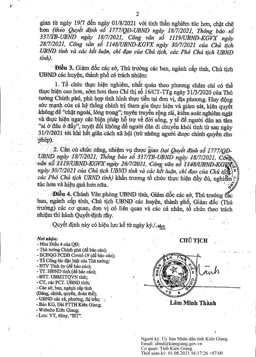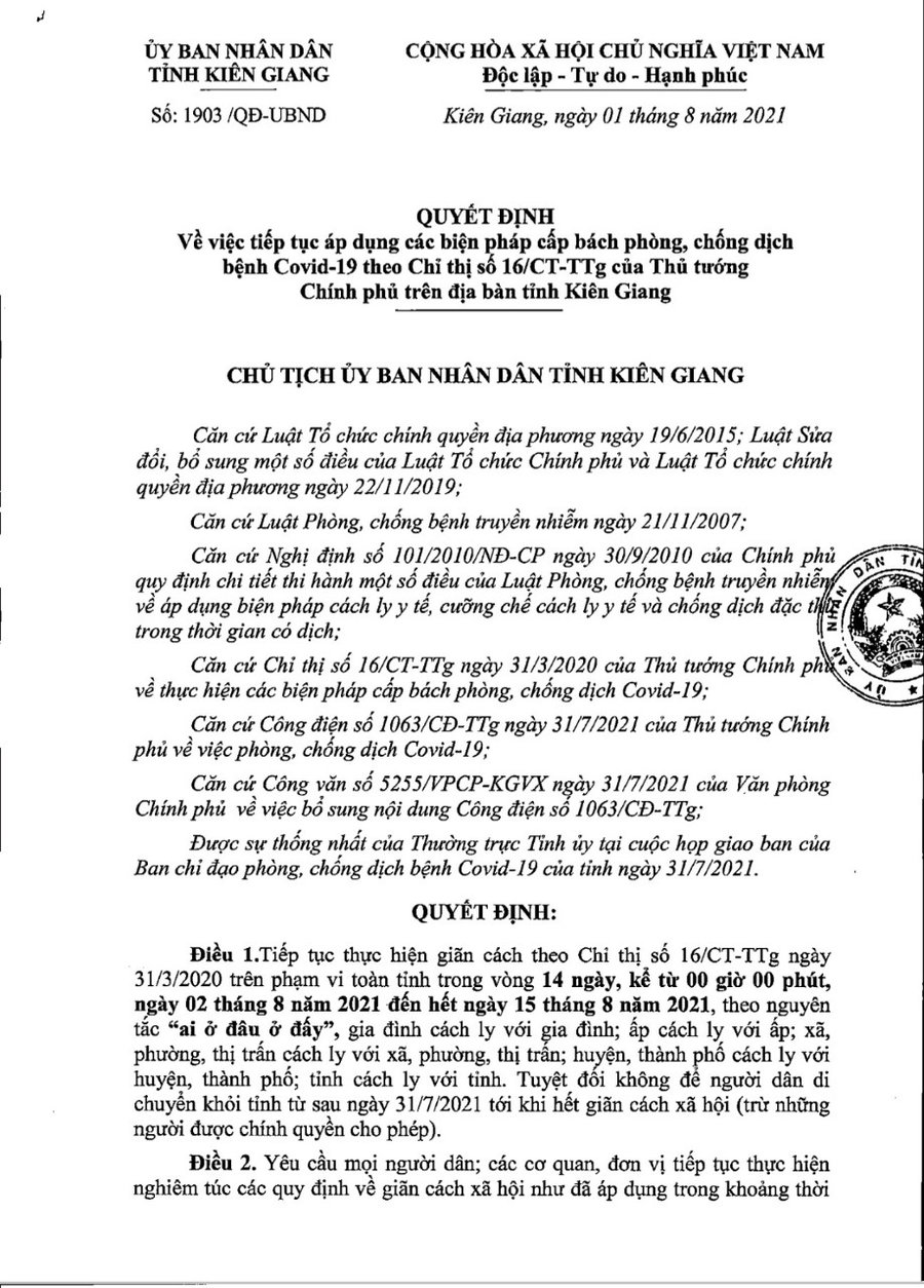 Ngày 01/8/2021 Chủ tịch UBND tỉnh Kiên Giang Lâm Minh Thành ký ban hành Quyết định số 1903/QĐ-UBND về việc tiếp tục áp dụng các biện pháp cấp bách phòng, chống dịch bệnh Covid-19 theo Chỉ thị số 16/CT-TTg của Thủ tướng Chính phủ trên địa bàn tỉnh Kiên Giang.